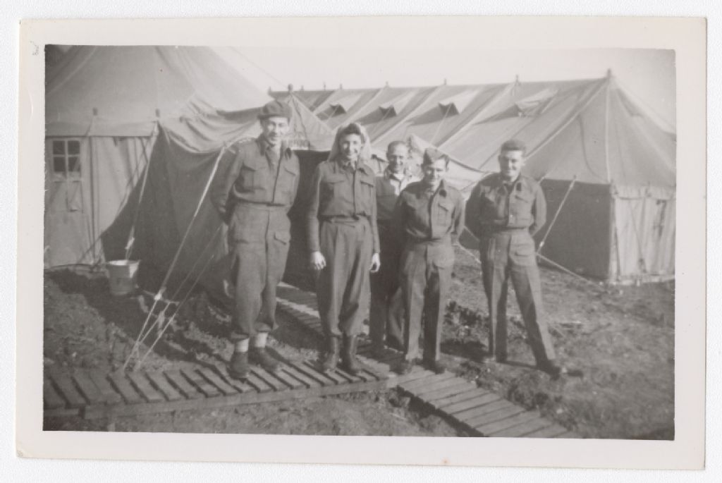 Cette photographie illustre quatre soldats et une infirmière militaire au campement. Ils sont à l'entrée d'une tente. On observe une autre longue tente près d'eux. Trois soldats et l'infirmière sont debout sur les passerelles de bois prévenant les petites crevasses du sol. Cette photographie a été prise entre les années 1939 et 1945