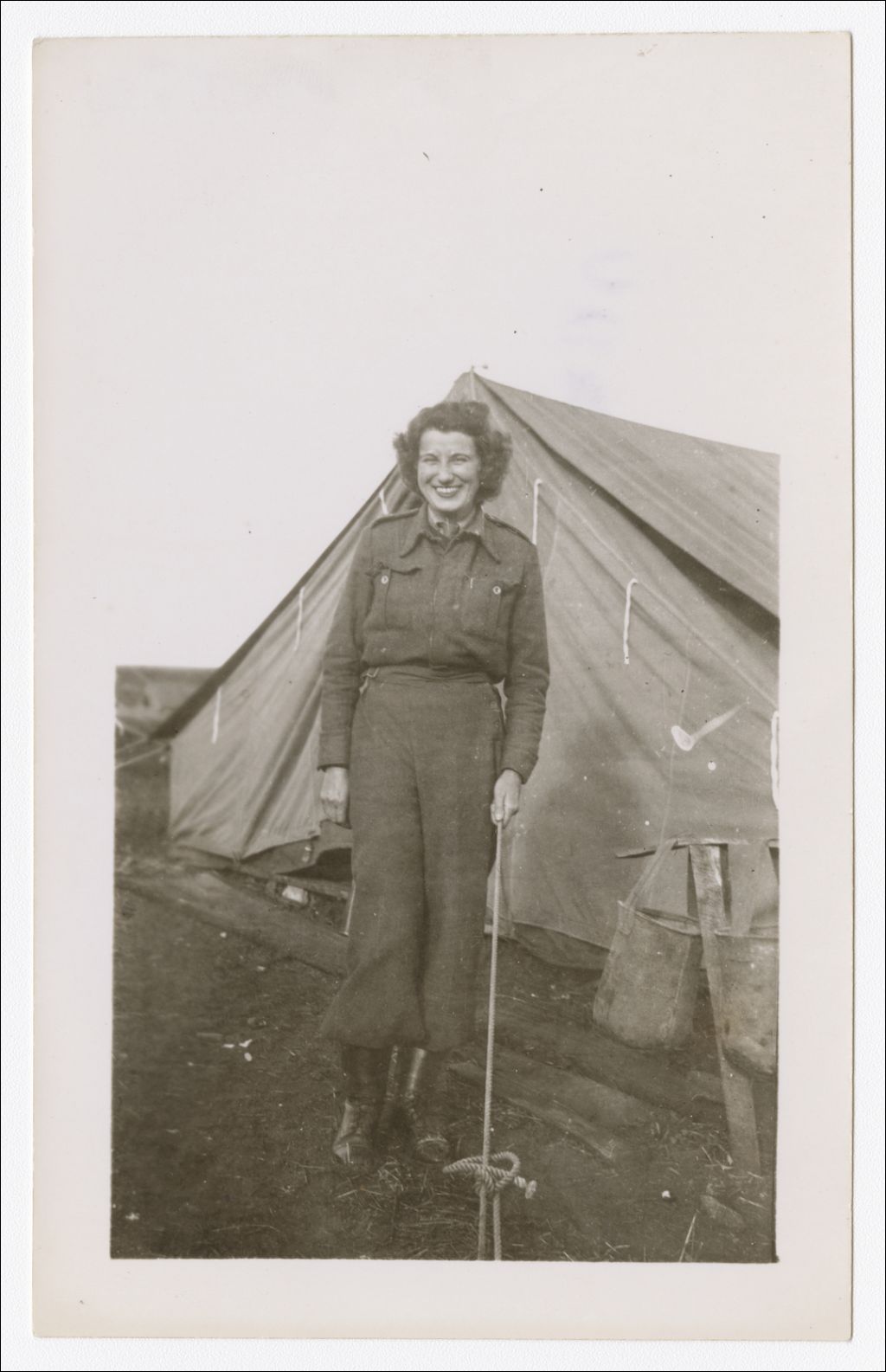 Cette photographie illustre le portrait d'une femme militaire debout devant une tente. Elle tient de sa main gauche une des cordes tenant la tente. À sa droite, on aperçoit deux seaux. Cette photographie a été prise entre les années 1939 et 1945