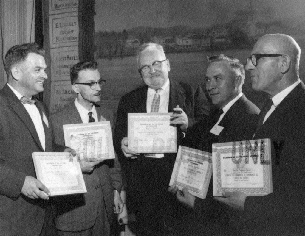 - Ce dossier montre les membres de l'Union des Chambres de commerce de l'Ouest du Québec, fondée en 1934 par Aimé Guertin, lors de leurs congrès semi-annuels (en mai et en octobre). Comme chaque congrès se tient dans un village différent, les photographies montrent les congressistes, lors de réunions, ou devant l'église paroissiale ou l'hôtel de ville, lors des congrès suivants : Fort-Coulonge, mai 1946 ; Buckingham, octobre 1946 ; Pointe-Gatineau, octobre 1947 ; Thurso, mai 1948 ; Aylmer, mai 1949 ; Kazabazua, mai 1950 ; Val-des-Bois, juin 1952. On y voit aussi un groupe d'hommes dans un champ dont Raymond Berthiaume (1ère rangée, 5e de gauche à droite), Conrad Poirier (2e rangée, 6e de gauche à droite) et Horace Choquette(2e rangée; 2e de gauche à droite). On y voit également Aimé Guertin accompagné de politiciens et hommes d'affaires locaux (dont Joseph Matte, Royal Gauvin, Oswald Parent, Alexis Caron, Lionel Mougeot) à l'hôtel St [...]
