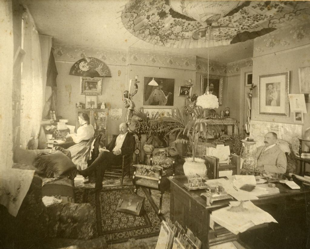 Richard Ritchie et son épouse (à la dactylo) au salon de la résidence Ritchie, Forest House, à Bryson