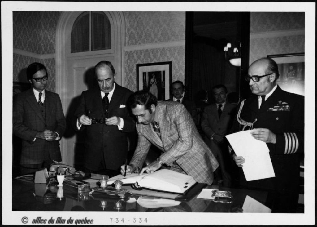 Assermentation d'Oswald Parent comme ministre devant Robert Bourassa et le Lieutenant-Gouverneur Hugue Lapointe, 21 février 1973, Archives nationales à Gatineau, Fonds Oswald Parent, (07H,P58,S1,D82), Office du Film du Québec.