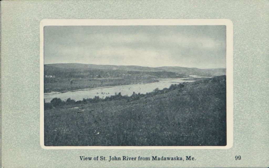 On y voit l'édifice et paysage suivant : "St. David's Catholic Church, St. David, Me." et "View of St. John River from Madawaska, Me." (Crassens Card Co., Belfast, Maine)