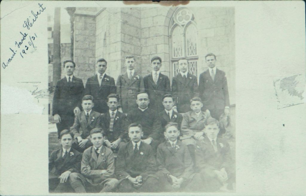 Avant-garde Hébert, 1920/21 : Groupe de jeunes gens devant une église avec l'abbé Joseph Hébert au centre