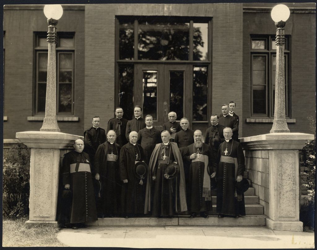 Photographie prise à l'occasion de la visite du Cardinal Louis-Ernest Dubois de Paris à Ottawa; parmi eux, se trouvent Mgr Émard, évêque de l'archidiocèse d'Ottawa, et l'abbé Joseph Hébert