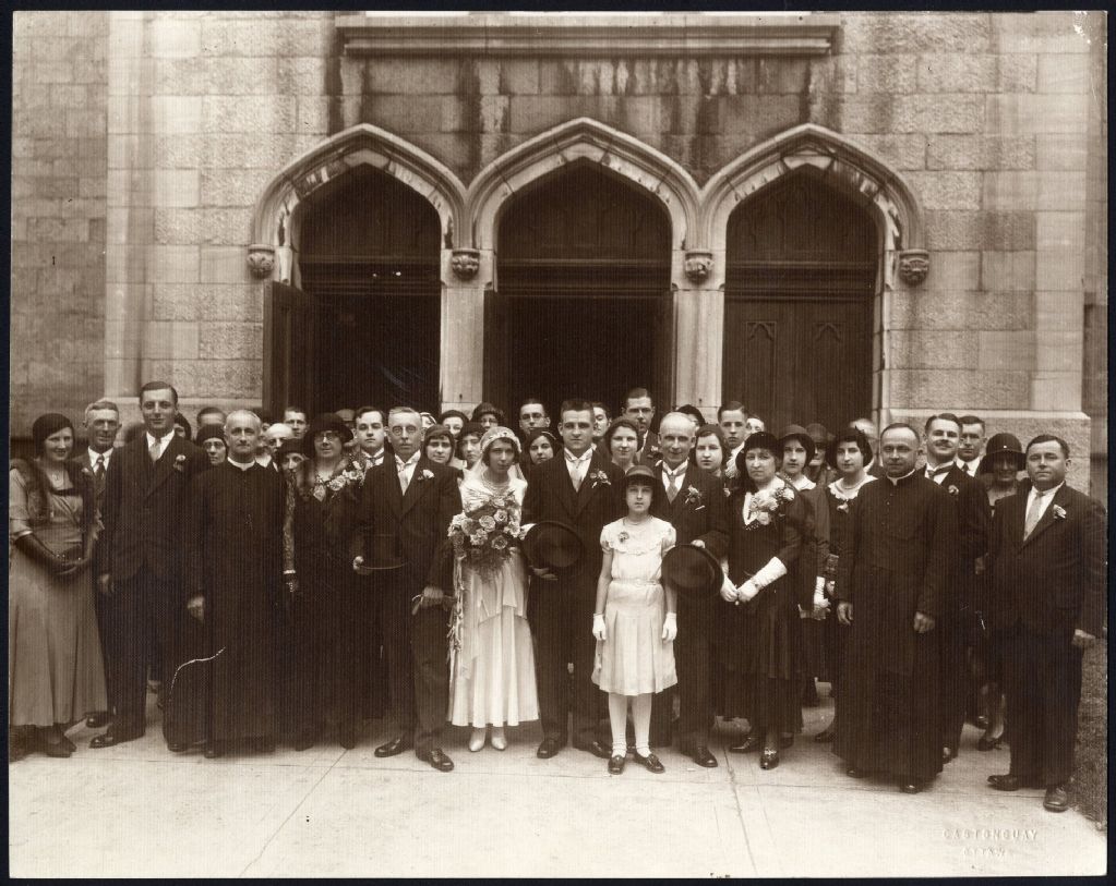 Noces à la sortie d'une église; l'abbé Joseph Hébert, sur la droite