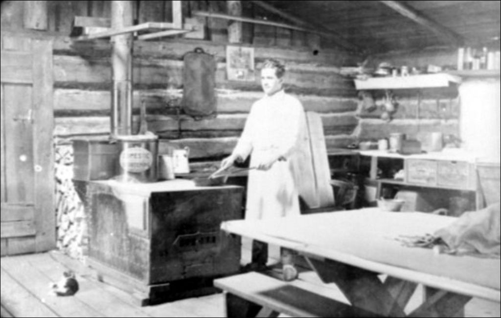 Hormidas Lépine, préparant un repas, dans une cuisine de chantier, [192-?], Archives nationales à Gatineau, Fonds Émile Laurent, (07H,P74,D276), Attribué à Émile Laurent.