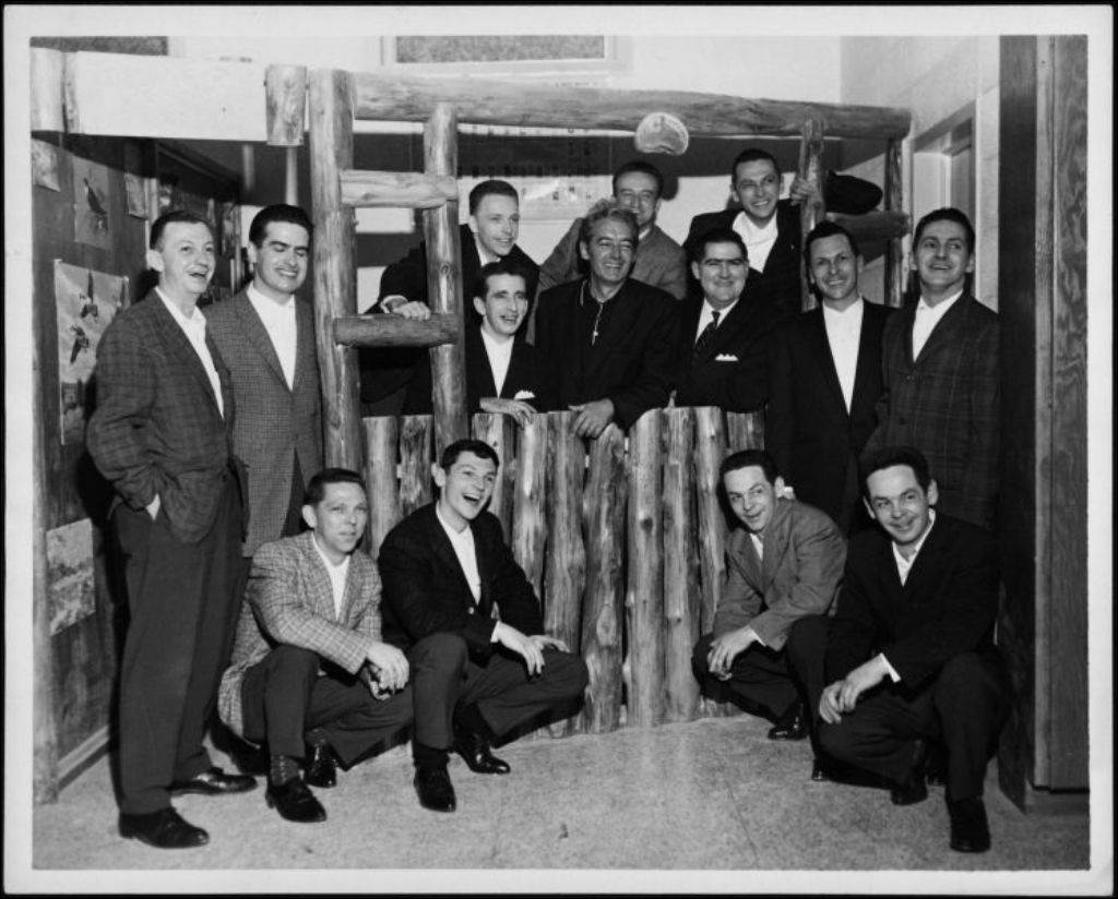 Félix Leclerc et les membres du groupe "Les Joyeux Camarades" avant un concert au sous-sol de la Salle Saint-Joseph, rue Berry, à Hull