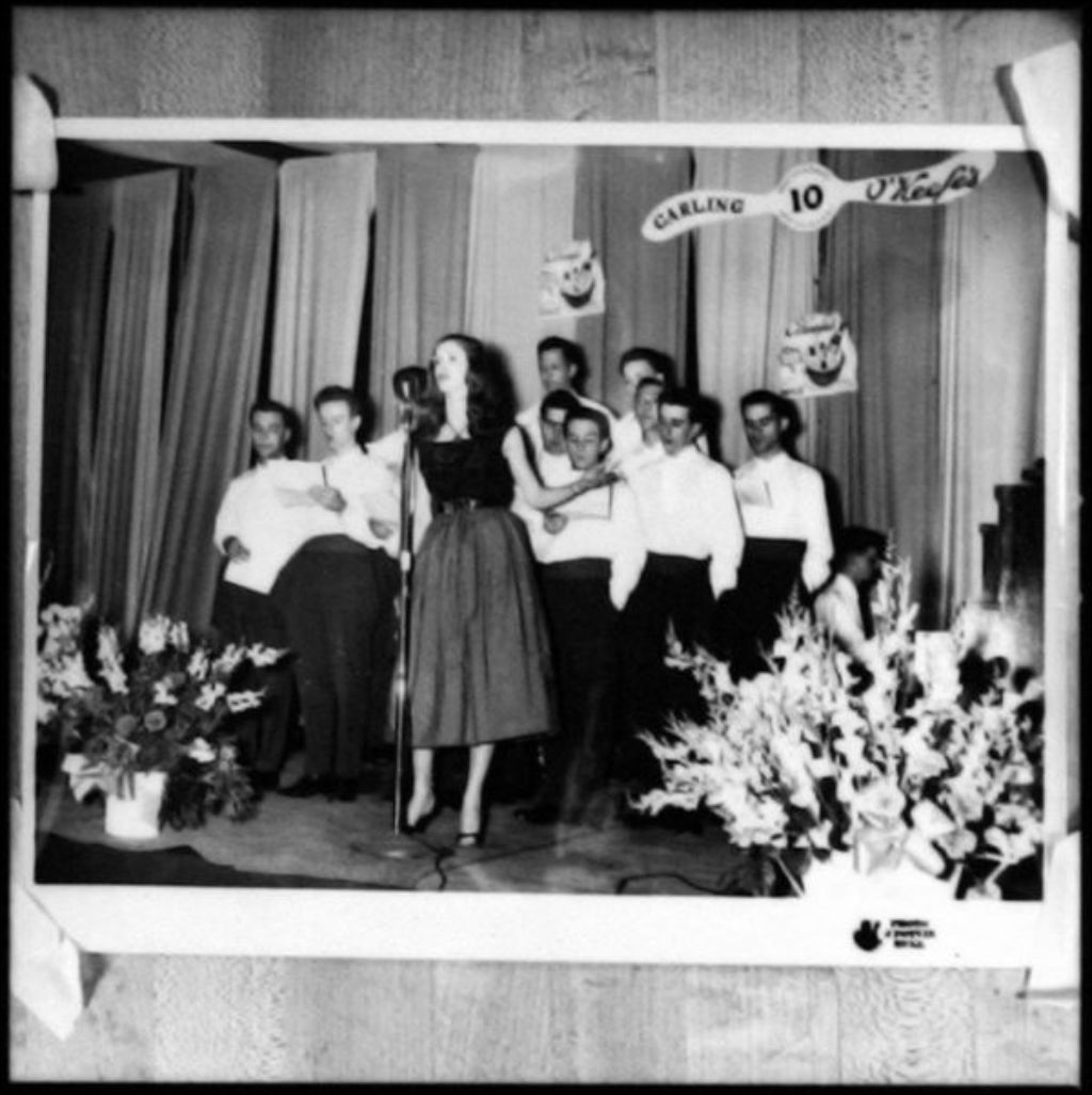Colette Devlin au micro, accompagnée du groupe de choristes "Les Joyeux Camarades"