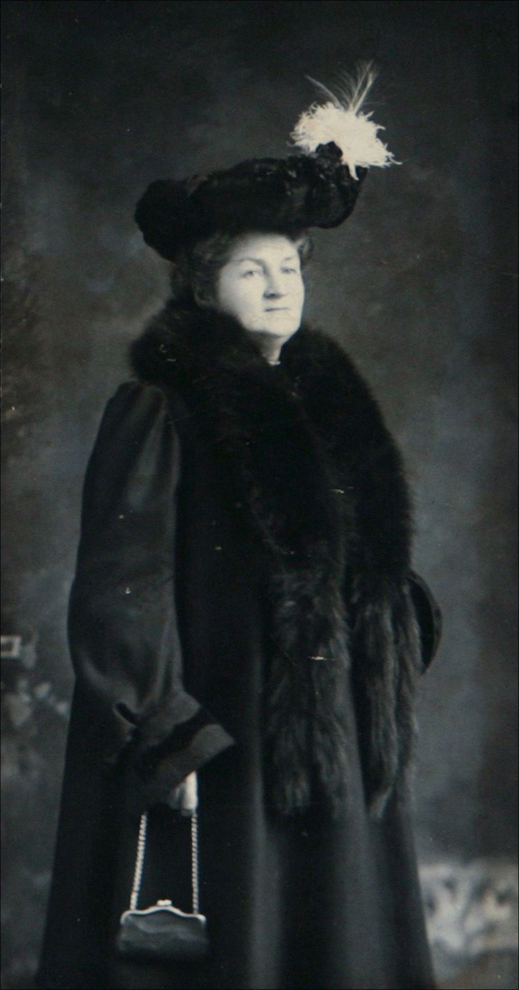 Femme debout avec chapeau de plume et fourrure