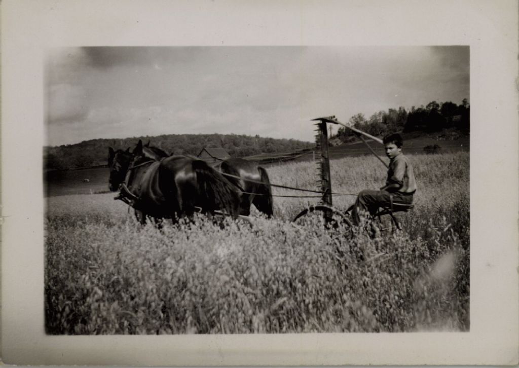 - Bâtiments de ferme -- Travaux sur la ferme -- Récolte de foin -- Construction d'une grange -- Attelage de chevaux -- Machineries et instruments aratoires (tracteurs, faucheuse, etc.) -- Construction d'un petit bâtiment (jeune homme noir) -- Défrichement et essouchement -- Paysages