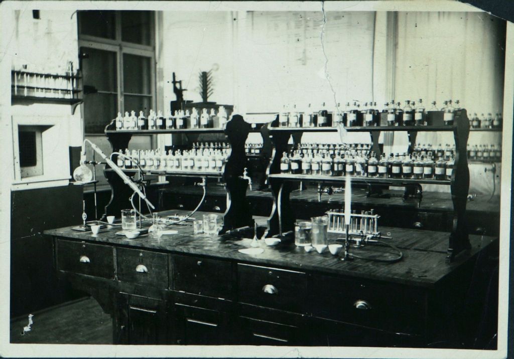 Intérieur d'une pharmacie : flocons, éprouvettes, brûleurs
