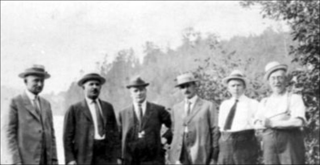 Groupe d'entrepreneurs forestiers, dont Louis-P. Dessureault, Reproduit vers 1985 (original créé vers 1930), Archives nationales à Gatineau, Collection Centre de l'Outaouais de Bibliothèque et Archives nationales du Québec, (07H,P1000,S8,D14,P4), Photographe non identifié.