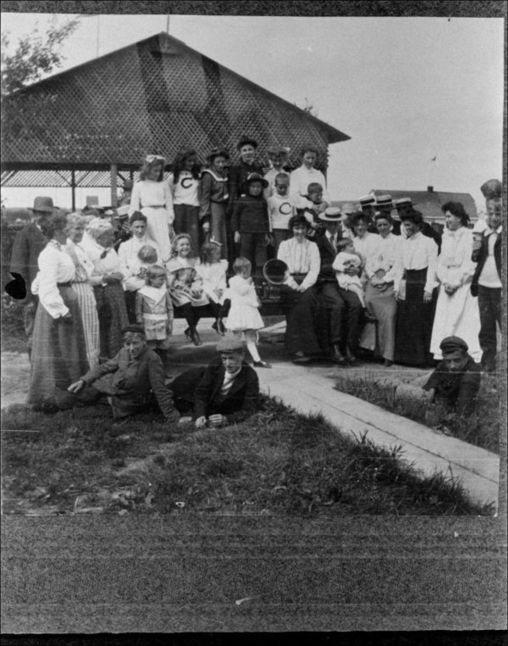 Vacanciers (enfants, femmes & hommes) devant le kiosque de la Villa Chabot à Papineauville ; phonographe au centre, femme tenant raquette de tennis, Reproduit vers 1985 (original créé vers 1915), Archives nationales à Gatineau, Collection Centre de l'Outaouais de Bibliothèque et Archives nationales du Québec, (07H,P1000,S8,D18,P6), Photographe non identifié.