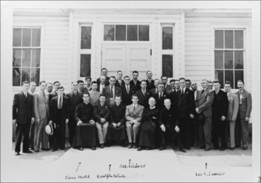 Parmi le groupe photographié devant l'église Notre-Dame-de-Lorette à Hull, se trouvent Pierre Martel, Rodolphe Bélisle, J.-Edmond Bériault et Léo Labelle