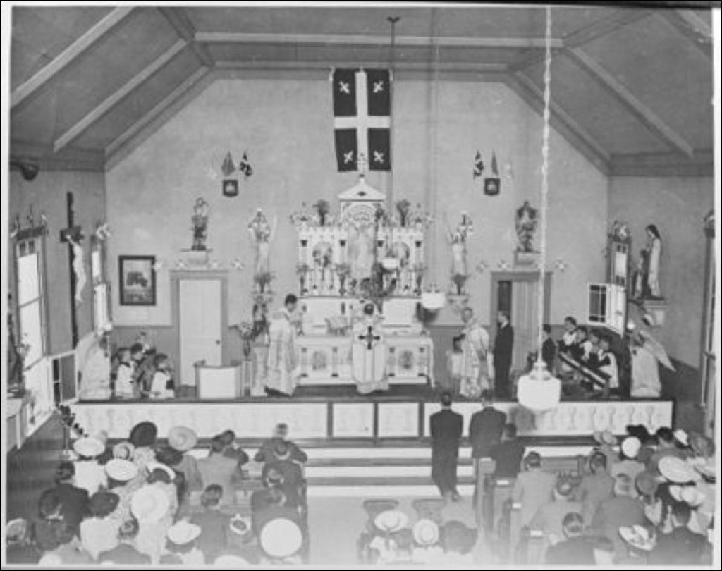 Fidèles assistant à une messe et intérieur de l'église Notre-Dame-de-Lorette de Val-Tétreau à Hull