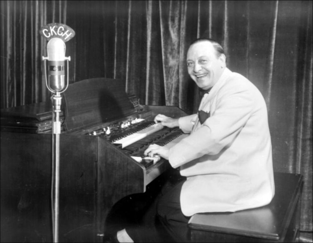 Aurèle Groulx à l'orgue au micro de CKCH, Reproduit vers 1995 (original créé vers 1950), Archives nationales à Gatineau, Collection Centre de l'Outaouais de Bibliothèque et Archives nationales du Québec, (07H,P1000,S8,D53,P1), Studio C. Marcil.