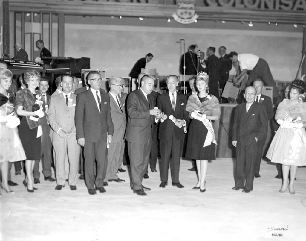 Monsieur Robert Choquette, commissaire associé de l'Administration du centenaire de la confédération, procède à l'ouverture de l'Exposition forestière régionale au Forum de Rouyn, à sa droite, Louise Arcand, élue Reine de l'Ouest du Québec en 1962, à sa gauche Gaudiose Dubé, président du Comité de l'Exposition régionale, H.S. Bérubé, Réal Caouette, député du Ralliement créditiste dans la circonscription électorale fédérale Villeneuve et membre du Comité d'honneur