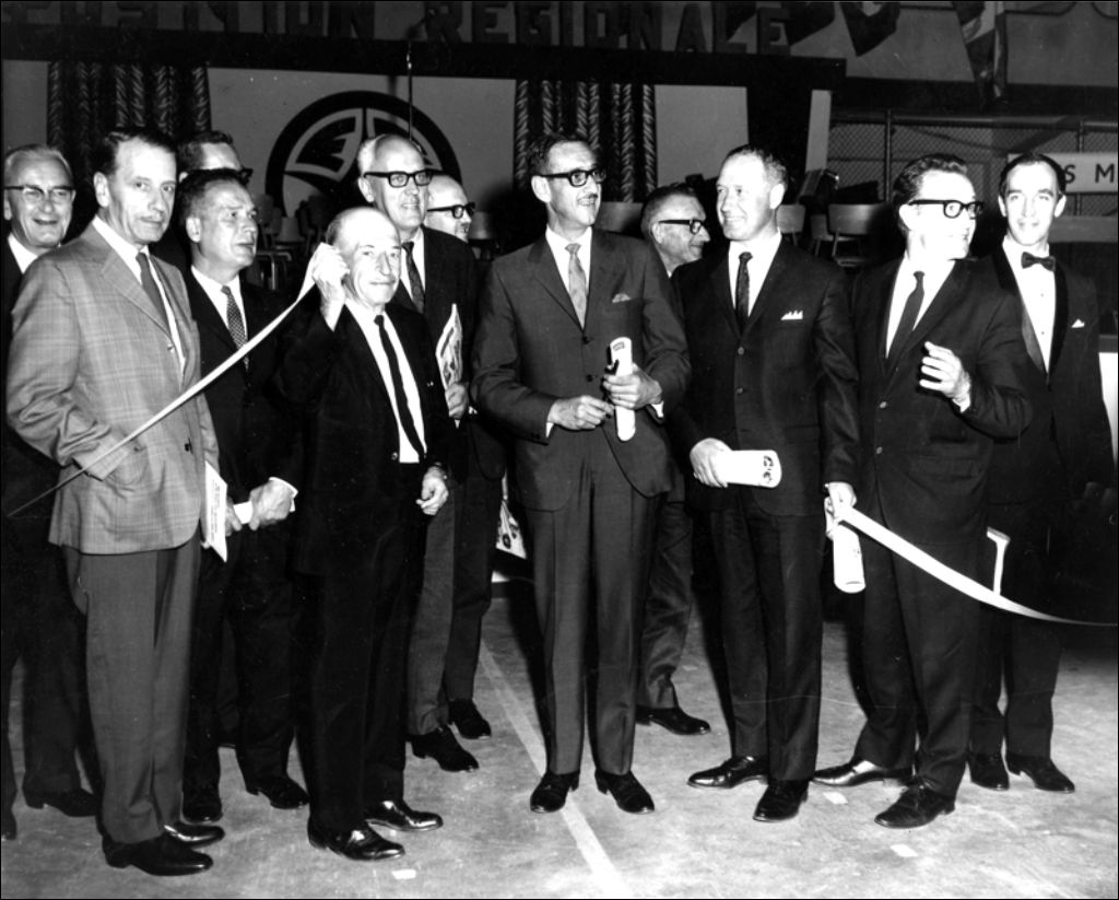 Paul-Emile Allard (au centre), Ministre des Richesses naturelles procède à l'ouverture de la 20e Exposition régionale au Forum de Rouyn, derrière lui (à sa droite) Réal Caouette, député du Crédit social de la circonscription électorale fédérale Témiscamingue et membre du Comité d'honneur de l'exposition