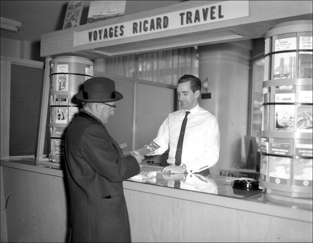 Réal Caouette au comptoir de l'agence de voyages "Voyages Ricard Travel"