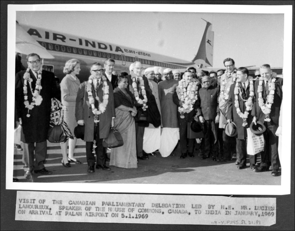 Visite de la délégation des parlementaires canadiens dirigé par H.E M. Lucien Lamoureux, président de la Chambres des Communes du Canada.Réal Caouette est placé le 3e à partir de la gauche.