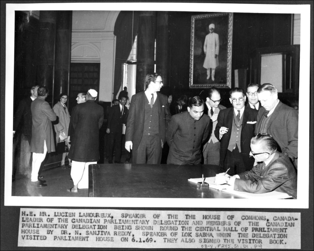 H.E. M. Lucien Lamoureux, président de la Chambre des Communes, chef de la délégation parlementaire canadienne et les membres de la délégation parlementaire canadienne sont conduits dans le hall central du Parlement par le Dr. N. Sanjiva Reddy, président du Lok Sabha, lorsque la délégation a visité le Parlement en 1969. Ils ont également signé le livre des visiteurs.Réal Caouette est à l'extrême droite signant le registre des visiteurs.