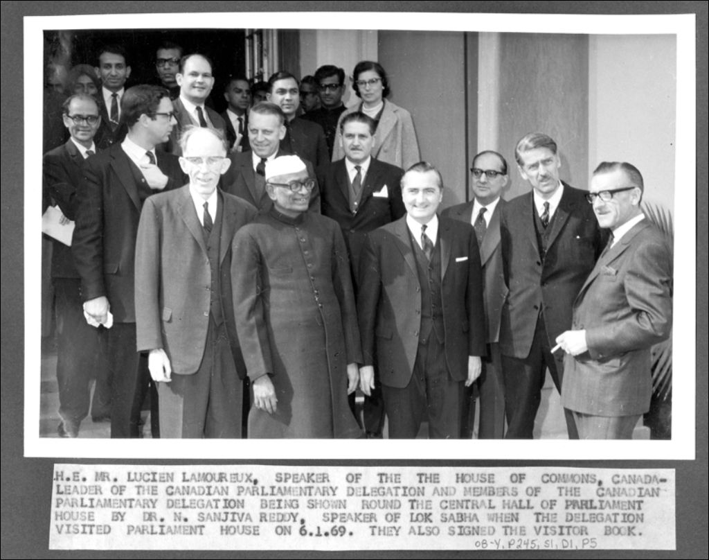M. Lucien Lamoureux, président de la Chambre des Communes, chef de la délégation parlementaire canadienne, et des membres de la délégation parlementaire canadienne sont conduits dans le hall central du parlement par le Dr. N. Sanjiva Reddy, président du Lok Sabha, lors de la visite de la délégation au parlement en 1969. Ils ont également signé le livre des visiteurs.Réal Caouette (à l'extrême droite) en compagnie des membres de la délégation des parlementaires canadiens au Parlement indien.