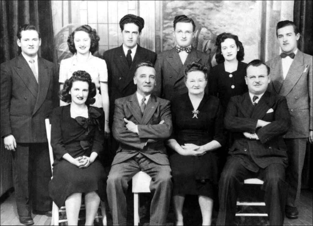 Samuel Caouette et Marie Cloutier, les parents de Réal Caouette, entourés de leurs enfants. Dans la première rangée de gauche à droite : Simone, Samuel, Marie Cloutier, Maurice, dans la deuxième rangée : Claude, Jeannine, Conrad, Réal, Cécile et Paul