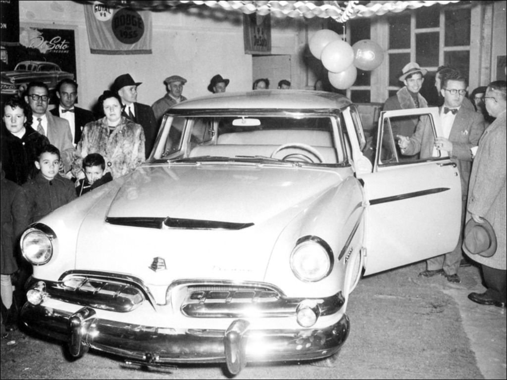 Réal Caouette (2e à droite), profite de la fête reconnaissant l'efficacité du service du Garage Joyal par la firme Chrysler, pour présenter les nouveaux modèles Dodge de l'année 1954