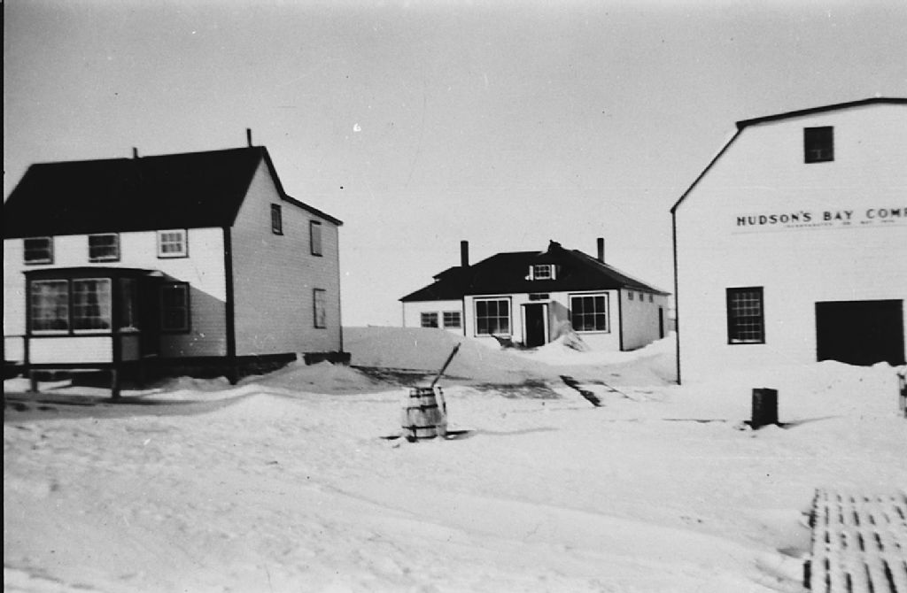 Cette photo montre les installations de la Hudson's Bay Company. À gauche on voit la maison des employés, au centre le magasin et à droite l'entrepôt à nourriture, comme la farine, le sucre, etc