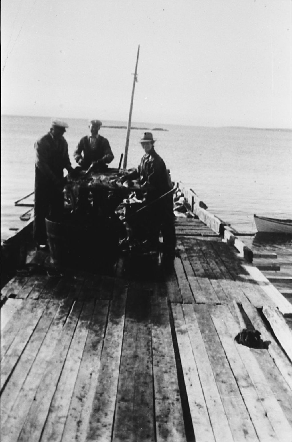 Aimé Morency, Lambert Gallibois et Gertrude Morency nettoient le poisson