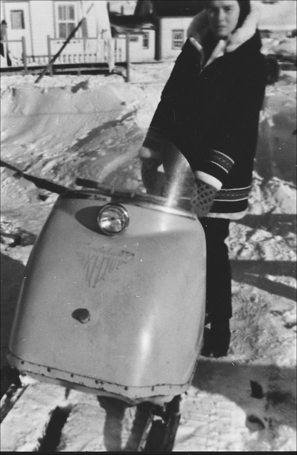 Gloria LeTemplier sur la première motoneige à Blanc-Sablon, appartenant à Clifford LeTemplier.