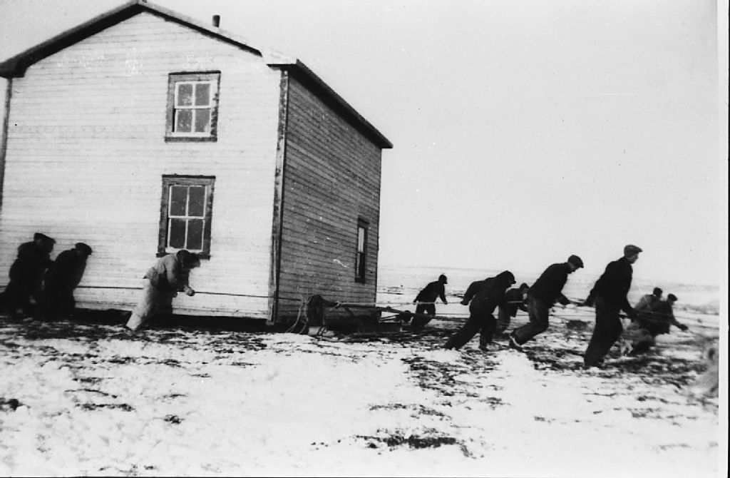 Déménagement de la maison de Ronald Lawless, 1950, Archives nationales à Sept-Îles, Fonds Groupe d'action et de développement économique et culturel de la Basse Côte-Nord, (09N,P12,S2,P42), Groupe d'action et de développement économique et culturel Basse-Côte-Nord.