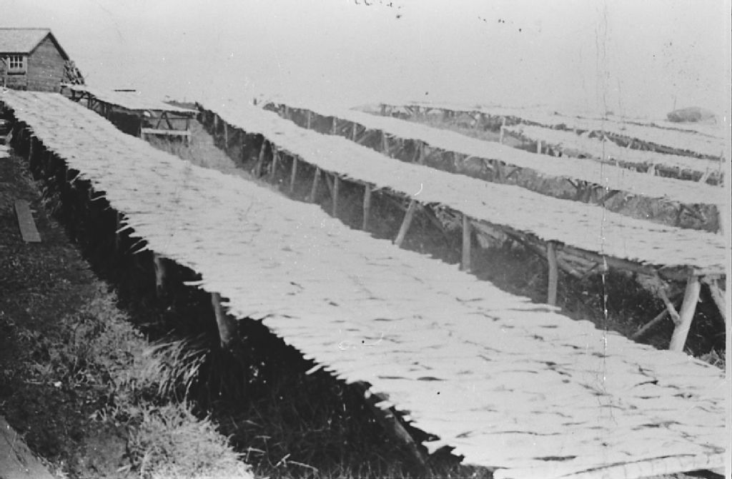 Séchage de la morue de George Hobbs à Brador (Ile du Bassin), Vers 1919, Archives nationales à Sept-Îles, Fonds Groupe d'action et de développement économique et culturel de la Basse Côte-Nord, (09N,P12,S2,P7), Groupe d'action et de développement économique et culturel Basse-Côte-Nord.
