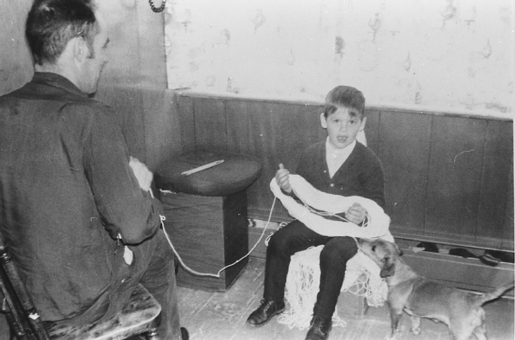 Émédé Beaudoin répare sa chaise, 1959, Archives nationales à Sept-Îles, Fonds Groupe d'action et de développement économique et culturel de la Basse Côte-Nord, (09N,P12,S2,P84), Groupe d'action et de développement économique et culturel Basse-Côte-Nord.