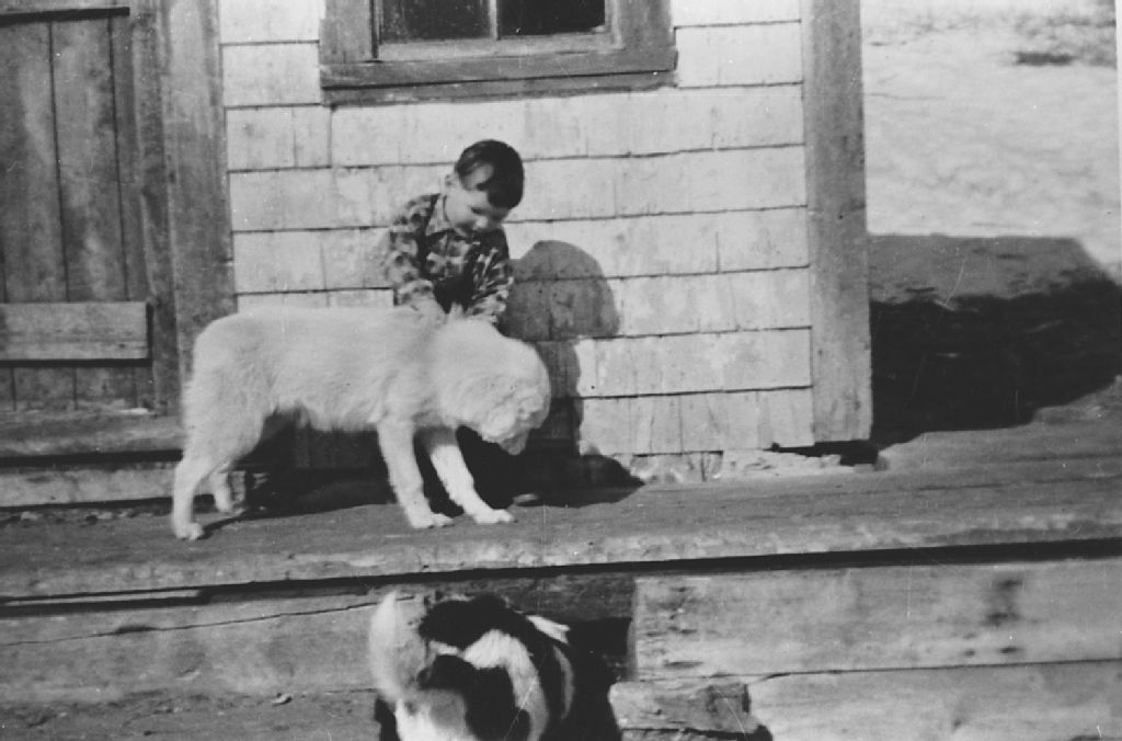Rodrigue Joncas jouant avec un chien à Middle Bay, [19-], Archives nationales à Sept-Îles, Fonds Groupe d'action et de développement économique et culturel de la Basse Côte-Nord, (09N,P12,S2,P86), Groupe d'action et de développement économique et culturel Basse-Côte-Nord.