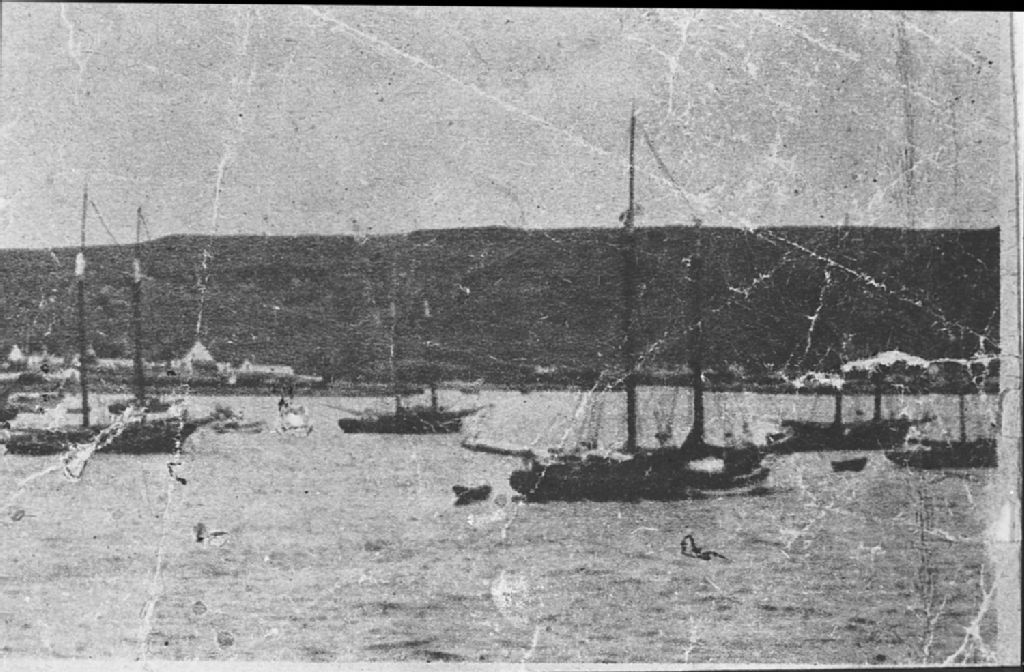 Flottille de chalutiers devant les bâtiments de la cie de la Baie d'Hudson à Blanc-Sablon