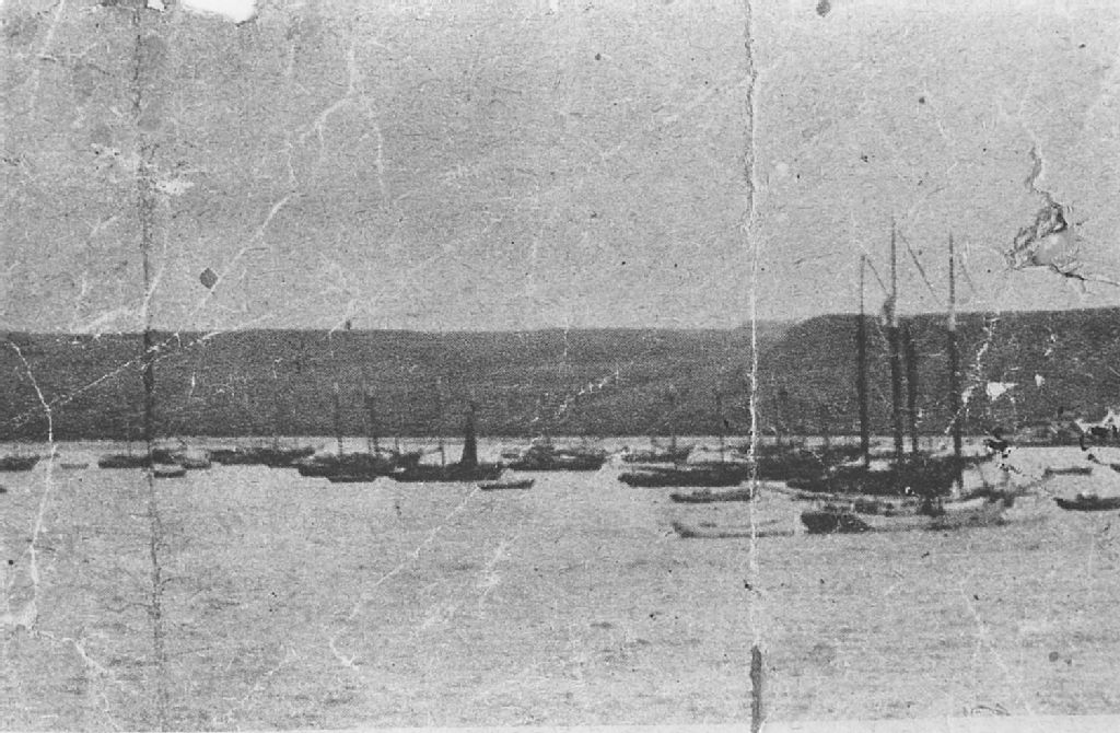 Flottille de chalutiers devant les bâtiments de la cie de la Baie d'Hudson à Blanc-Sablon