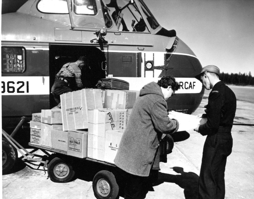 La photographie montre un avion qui arrive à La Romaine pour un appel d'urgence à cause d'une épidémie de gastro-entérite chez les jeunes enfants et les bébés. Aucune infirmière n'étant sur place, on demande un transport aérien urgent, 5 heures après, l'hélicoptère 9621 arrive de Québec en provenance de la base de Greenwood en Nouvelle-Écosse. La période de dégel n'étant pas encore complété