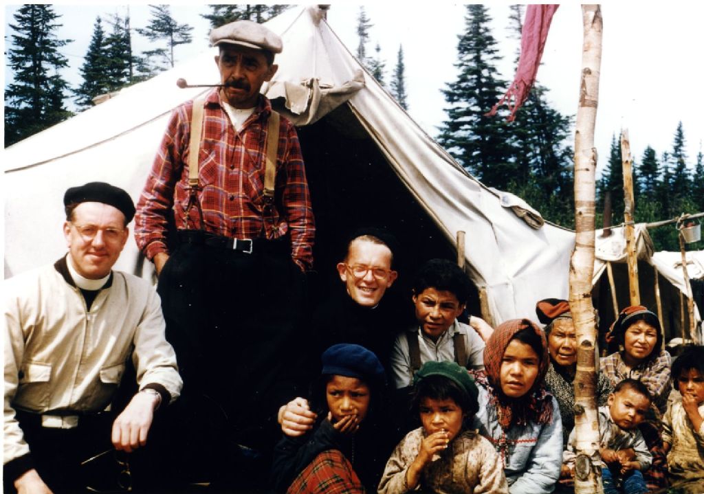 Pères Pirson et Jacob, o.m.i., le docteur Jean-Marie Bélanger et un groupe de Montagnais devant la demeure familiale, 1949-1960, Archives nationales à Sept-Îles, Fonds Pauline Laurin, (09N,P60,S1,SS4,P12), Laurin, Pauline.