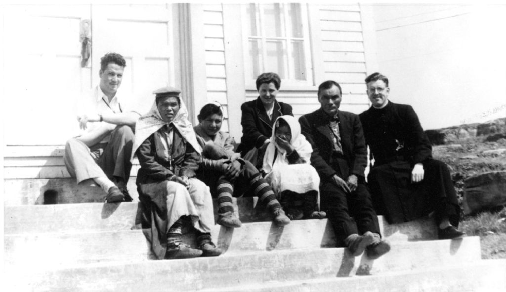 Dr. Jean-Marie Bélanger, Elizabeth Ashini, Jean-Baptiste Paulish, Pauline Laurin, Agnès Mestenapeo, Jean-Baptiste Mestenapeo et le père Jacobs, o.m.i., 1949-1960, Archives nationales à Sept-Îles, Fonds Pauline Laurin, (09N,P60,S1,SS4,P34), Laurin, Pauline.