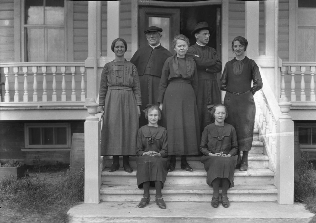 Groupe sur les marches de l'Évêché de Havre-Saint-Pierre, 1925, Archives nationales à Sept-Îles, Fonds Joseph-Émile Chabot, (09N,P61,S1,P97), Photographe non identifié.