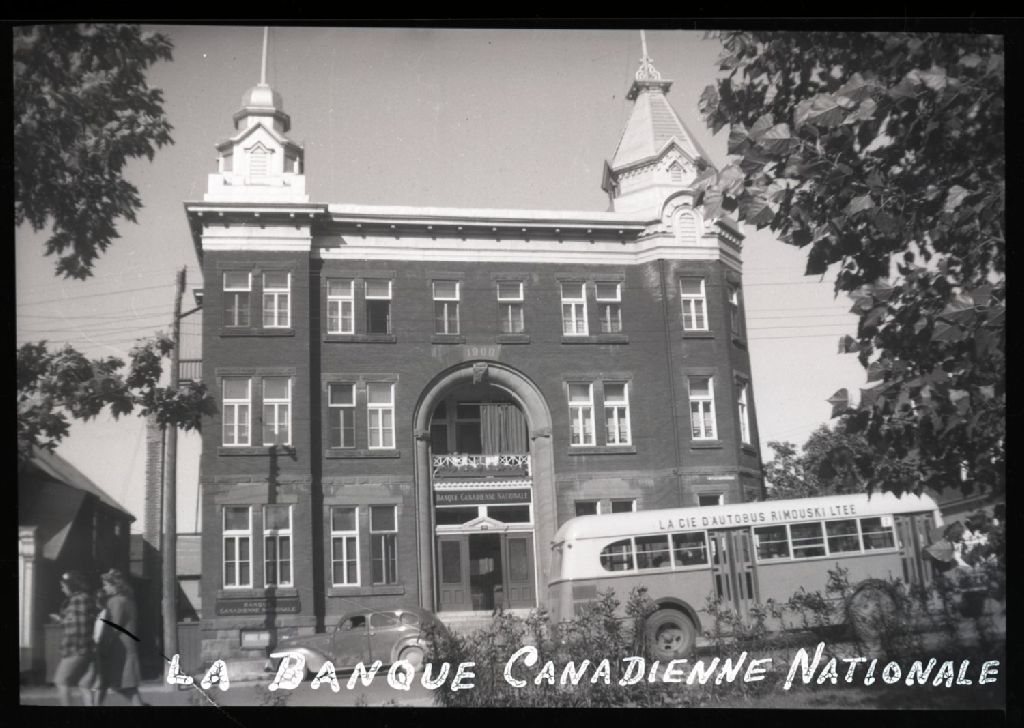 La pièce illustre l'édifice de la Banque Canadienne Nationale situé sur l'avenue de la Cathédrale. Au premier plan, on aperçoit un bus de la compagnie d'autobus de Rimouski.