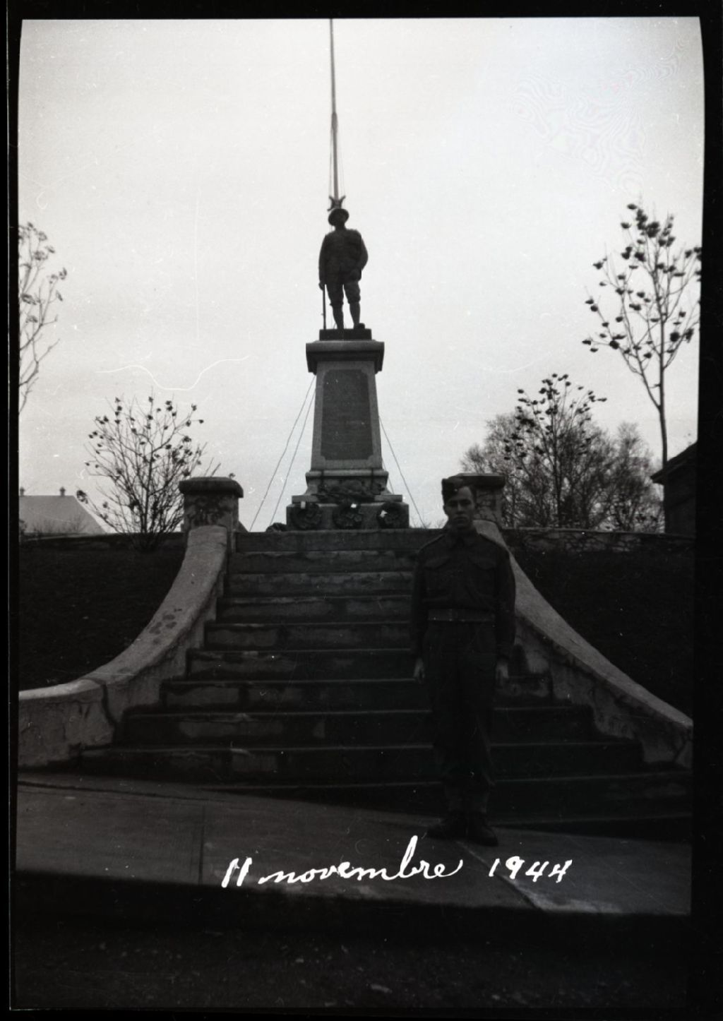 Soldat devant le monument des Braves, 11 novembre 1944, Archives nationales à Rimouski, Fonds J.-Gérard Lacombe (En traitement), (01R,P24,S3,SS3,D2,P37), J.-Gérard Lacombe.