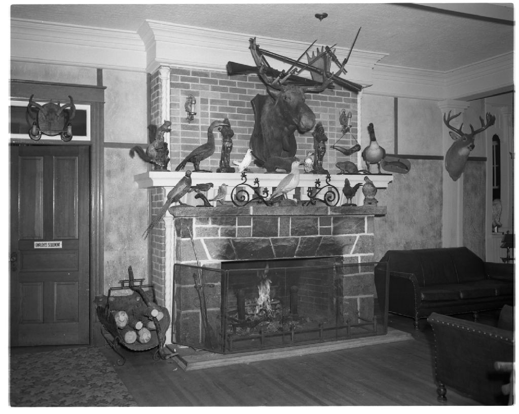 Foyer à l'intérieur de l'Hôtel Rocher Blanc, 7 août 1952, Archives nationales à Rimouski, Fonds J.-Gérard Lacombe (En traitement), (01R,P24,S3,SS7,D106), J.-Gérard Lacombe.