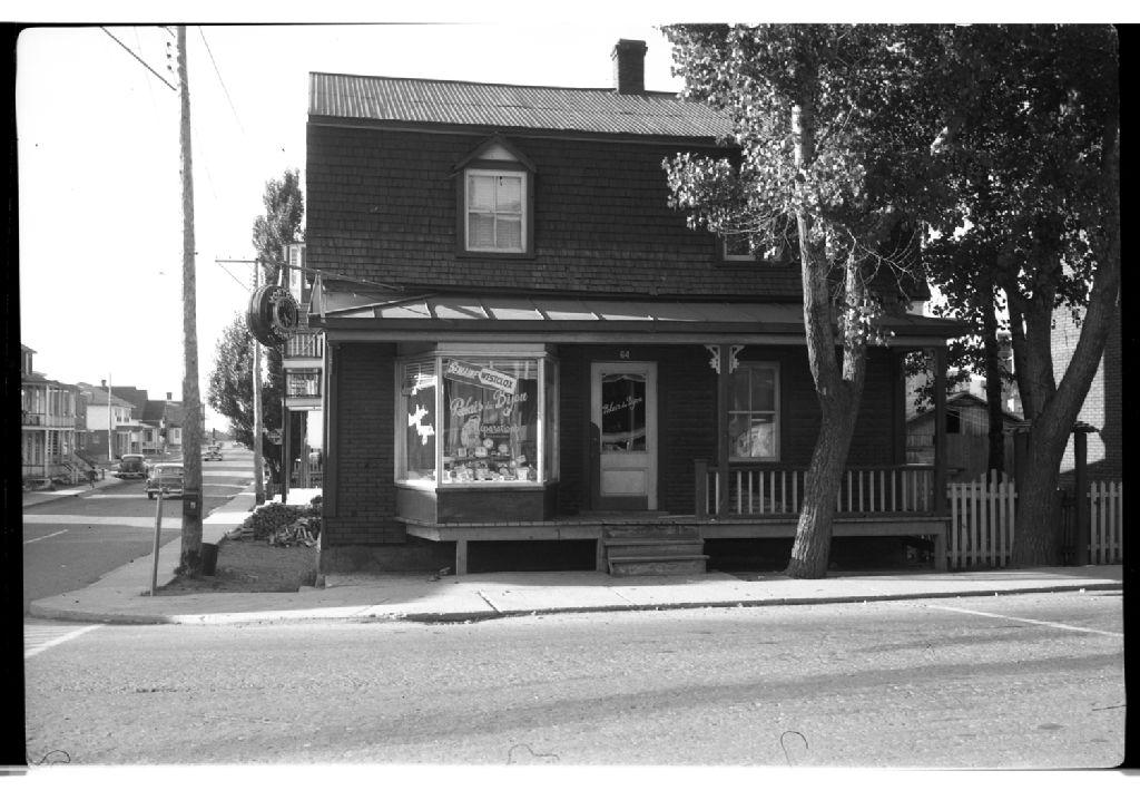 - Les photographie représentent la vitrine vu de proche et de loin. Le commerce était situé au coin de la rue Rouleau et de l'Évêché
