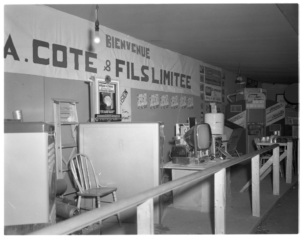 Le stand présent à l'exposition régionale de Rimouski expose des électroménagers et des téléviseurs.