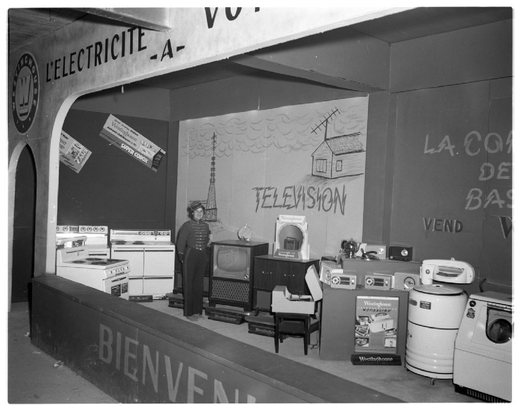 On aperçoit sur la photographie des électroménagers et des télévisions que la Compagnie de Pouvoir du Bas-Saint-Laurent présente à son stand à l'exposition régionale de Rimouski.