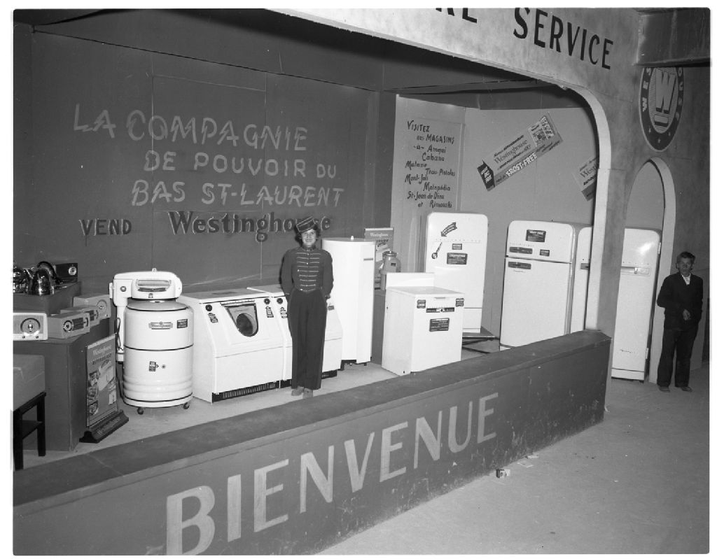 La photographie présente le stand de la compagnie qui expose à l'exposition régionale de Rimouski des électroménagers.