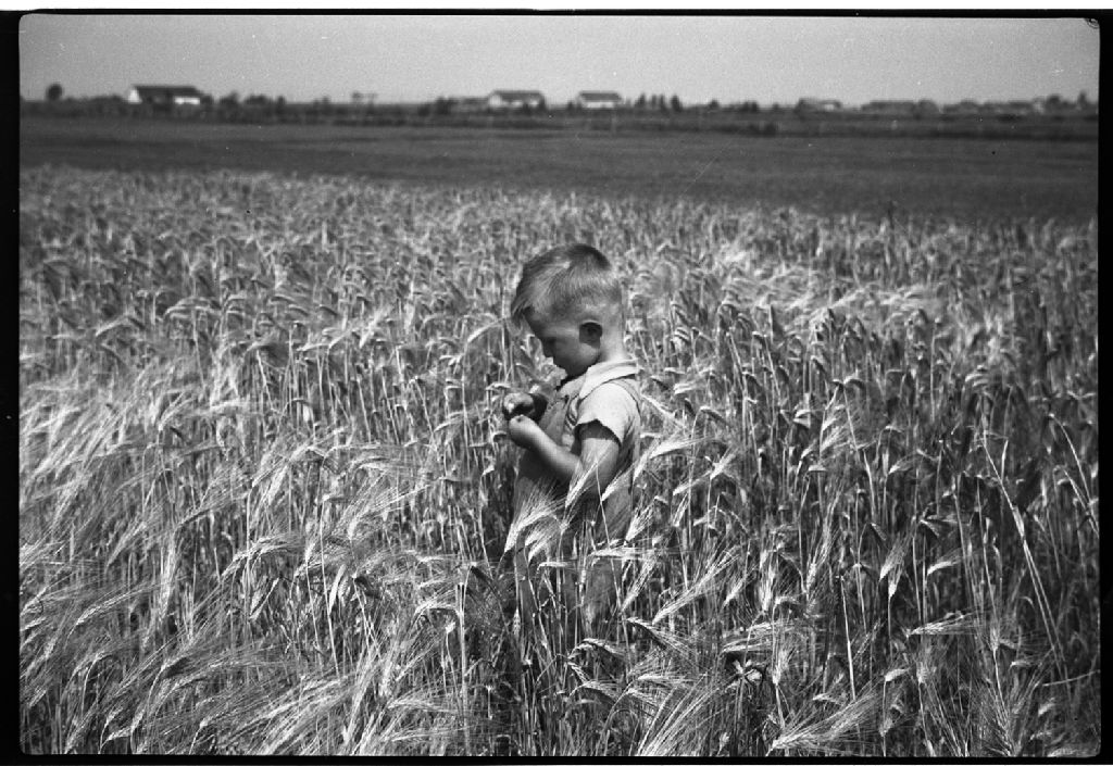 La photographie représente Clément Gagnon qui étudie le blé