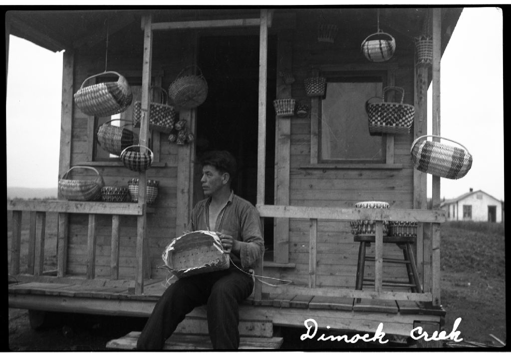 La photographie représente un micmac confectionnant des paniers en osiers à un stand à Dimock Creek lieu-dit de la réserve indienne Gesgapegiag